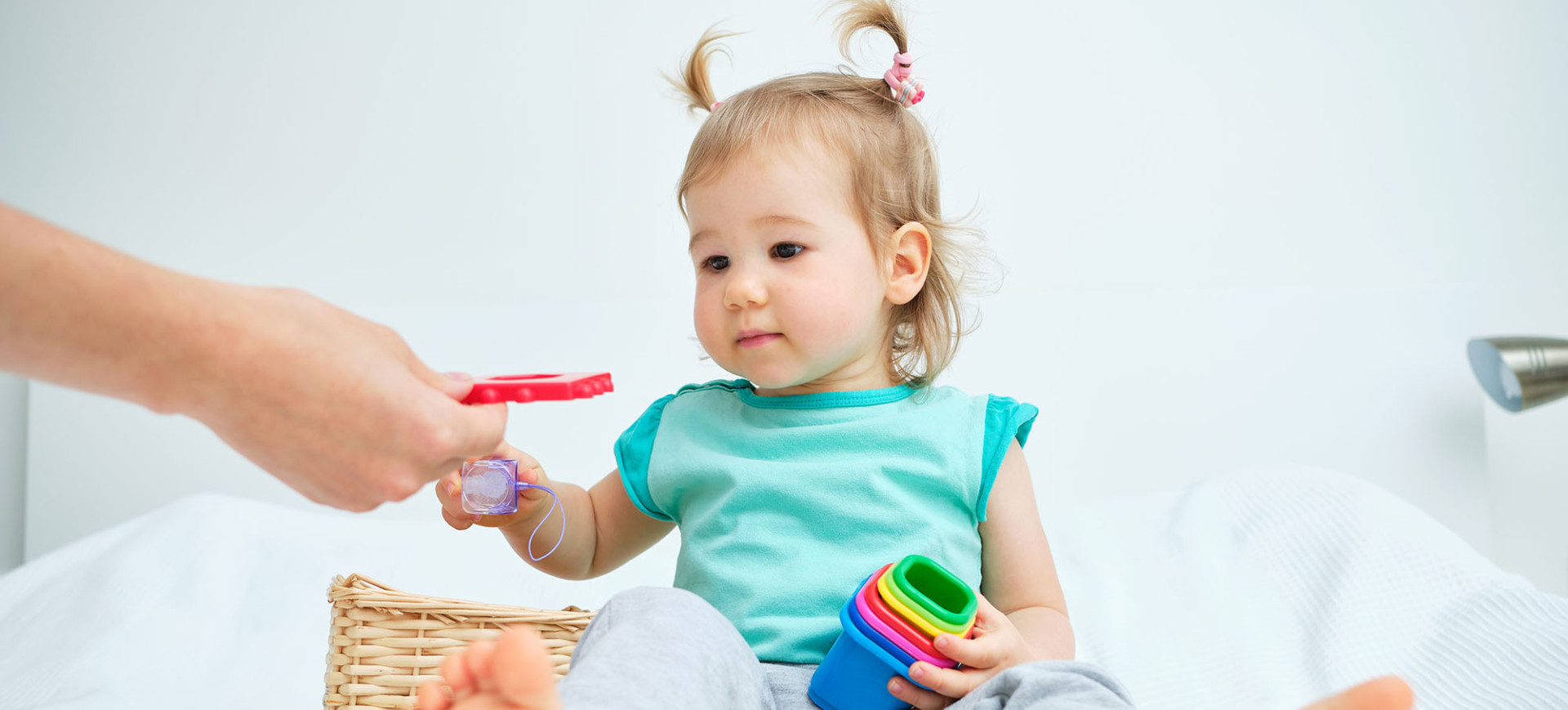 We hebben met een minicamera op een haarband gefilmd wat kinderen zien en doen tijdens exploratief spel. In dit fragment zie je een kind van ongeveer 1,5 jaar spelen met de regenboogvriendjes van Grimm. Bewegen, samen kijken naar hetzelfde object en doen gaan samen. Het kind ontdekt de mogelijkheden van de poppetjes door ze vast te pakken, te draaien en in en uit de bakjes te halen. Met veel aandacht en concentratie plaatst hij de poppetjes in en uit. Heel nauwkeurig pakt hij de poppetjes met duim en wijsvinger beet en zet ze boven op een bakje. Hij deelt zijn enthousiasme en communiceert met de pedagogisch medewerker. De pedagogisch medewerker volgt het initiatief van het kind en geeft woorden aan wat ze samen ervaren.