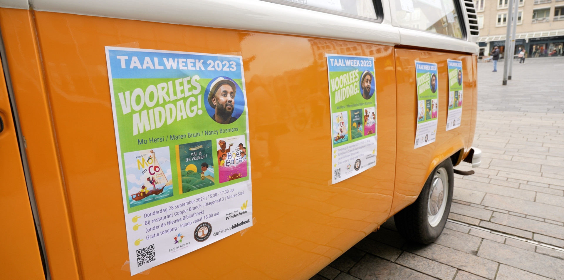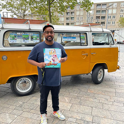 In die gesprekken kwamen we al snel uit op de Taalweek, en de daaraan verbonden taalambassadeur Mo Hersi, comedian en schrijver van een kinderboek. Met een tot de verbeelding sprekende oldtimer rijdt Mo Hersi door Almere, om op verschillende onderwijs gerelateerde plekken voor te lezen uit zijn eigen boek, en daarmee het taalbewustzijn te vergroten en (voor)leesplezier te verhogen. Zijn energieke persoonlijkheid en eigen veelbewogen geschiedenis op het gebied van taalontwikkeling en culturele diversiteit, en het feit dat hij zelf twee jonge kinderen heeft, geven een extra dimensie aan de thematiek.